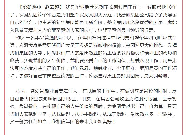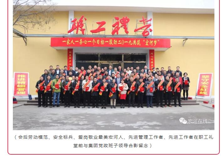 “集團(tuán)這次對(duì)2018年工作中涌現(xiàn)出來的勞動(dòng)模范、安全標(biāo)兵和愛崗敬業(yè)最美宏河人等先進(jìn)單位和先進(jìn)個(gè)人,進(jìn)行了隆重表彰。目的就是通過樹立一批扎根基層一線、踏實(shí)苦干實(shí)干的先進(jìn)典型,旗幟鮮明地告訴大家:集團(tuán)黨政始終關(guān)注在煤礦井上下愛崗敬業(yè)的職工,集團(tuán)黨政始終關(guān)注在公司車間班組基層一線愛崗敬業(yè)的職工,集團(tuán)黨政始終關(guān)注在不同崗位上辛勤工作、無私付出、愛崗敬業(yè)的職工?!?集團(tuán)黨委書記、董事長(zhǎng)張文,在大會(huì)講話中說。
