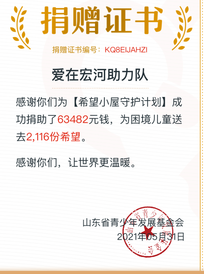 鄉(xiāng)村振興的路上, 孩子是我們最大的牽掛。 追逐夢想的途中, 愛是給孩子最好的賦能。 宏心向黨 聚力成河 讓希望、讓愛在宏河! 為一個孩子筑一方希望空間! “希望小屋”是共青團(tuán)山東省委、山東青年聯(lián)合會、山東省青少年發(fā)展基金會共同發(fā)起的困境兒童關(guān)愛項(xiàng)目,自2020年6月啟動發(fā)起募捐倡議以來,受到全社會廣泛關(guān)注和支持。2020年集團(tuán)共籌集到愛心捐款138611元,兩年來捐款所得款累計(jì)20萬余元,統(tǒng)一定向給鄒城市希望小屋項(xiàng)目建設(shè)。集團(tuán)廣大干部職工齊心協(xié)力從“希望小屋”出發(fā),以“為群眾辦實(shí)事”的初心責(zé)任,匯聚愛心傳遞對困境兒童的關(guān)愛,幫助更多有需要的孩子改善現(xiàn)狀走出困境,健康成長為祖國的棟梁之才。 近年來,宏河集團(tuán)秉承“幸福員工、鑄就未來、服務(wù)社會、溫暖人間”的企業(yè)使命,積極關(guān)注并致力于社會公益活動,通過黨、政、工、團(tuán)群體組織積極摸排協(xié)調(diào)并解決貧困職工家庭問題,特別是貧困殘疾人員家庭無獨(dú)立居住和學(xué)習(xí)環(huán)境孩子的教育問題。在以往金秋助學(xué)、愛心送考、精準(zhǔn)扶貧、慈心一日捐、抗疫捐款等工作及公益活動中,主動承擔(dān)社會責(zé)任,持續(xù)關(guān)心關(guān)注孩子們的生活和教育問題,希望通過此次為“希望小屋”的捐款,幫助更多孩子們健康成長。 自“希望小屋”兒童關(guān)愛項(xiàng)目實(shí)施以來 一座座“希望小屋”陸續(xù)在齊魯大地 生根萌芽、開花結(jié)果 “希望小屋” 承載著愛與希望 呵護(hù)每一個孩子的心靈 守護(hù)每一個家庭的未來 涓涓細(xì)流匯聚大愛江海 點(diǎn)點(diǎn)星光閃耀希望銀河 每一份愛心都將化為強(qiáng)大的力量 我們將帶著大家共同的愛繼續(xù)前進(jìn) 給需要幫助的孩子生活帶來改變 用“小小的善舉” 助力孩子們“大大的夢想”! |