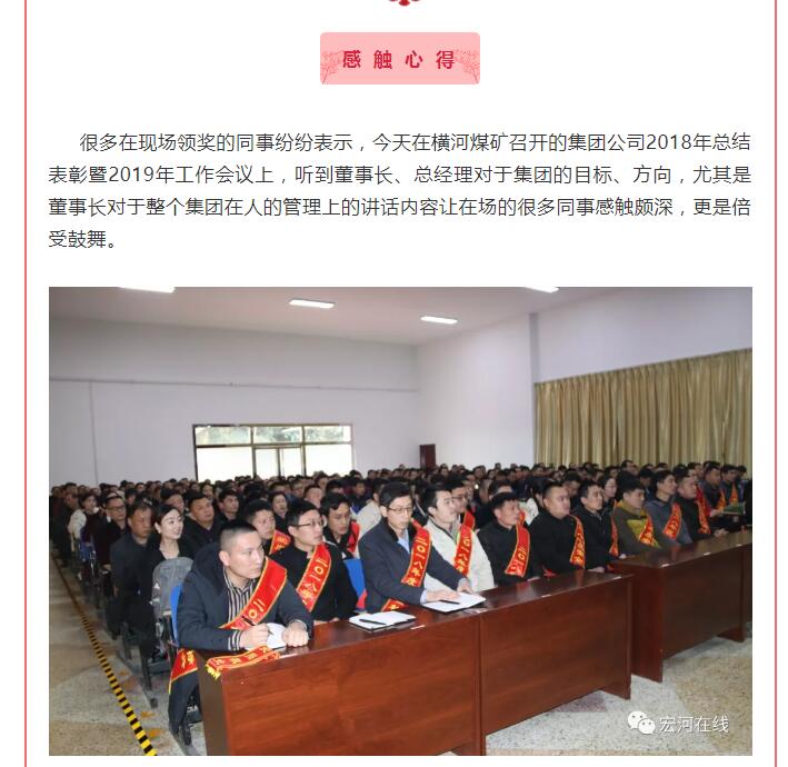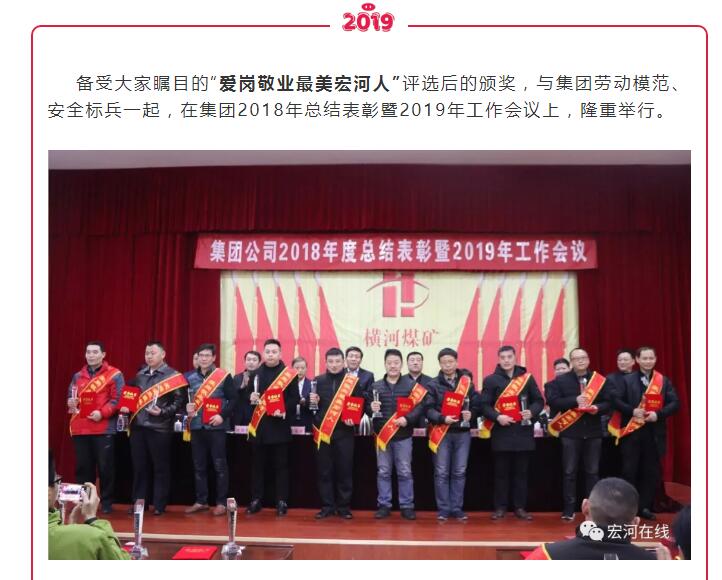 “集團(tuán)這次對(duì)2018年工作中涌現(xiàn)出來的勞動(dòng)模范、安全標(biāo)兵和愛崗敬業(yè)最美宏河人等先進(jìn)單位和先進(jìn)個(gè)人,進(jìn)行了隆重表彰。目的就是通過樹立一批扎根基層一線、踏實(shí)苦干實(shí)干的先進(jìn)典型,旗幟鮮明地告訴大家:集團(tuán)黨政始終關(guān)注在煤礦井上下愛崗敬業(yè)的職工,集團(tuán)黨政始終關(guān)注在公司車間班組基層一線愛崗敬業(yè)的職工,集團(tuán)黨政始終關(guān)注在不同崗位上辛勤工作、無私付出、愛崗敬業(yè)的職工?!?集團(tuán)黨委書記、董事長(zhǎng)張文,在大會(huì)講話中說。